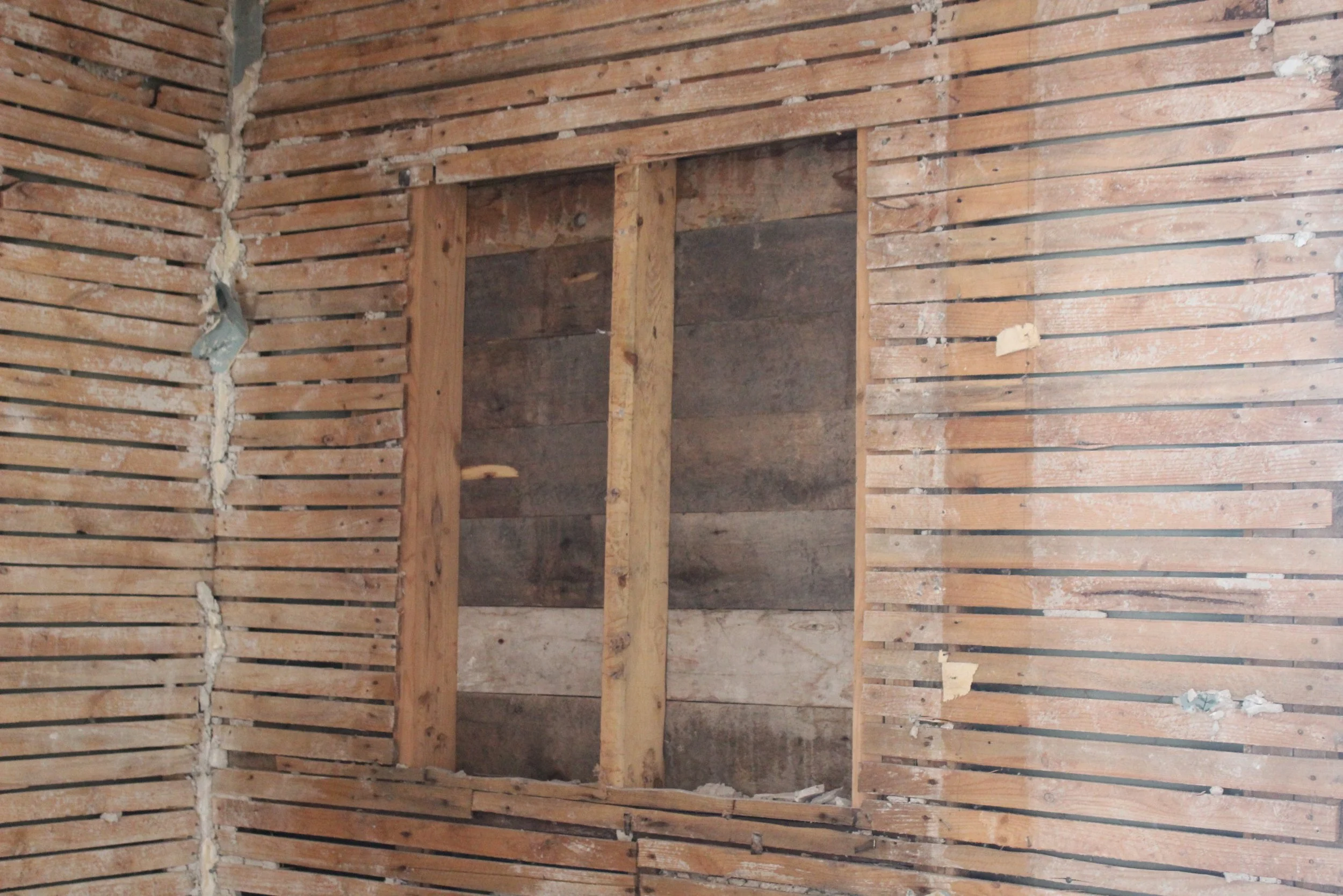 We also found this window in the bathroom and a door from the entryway into the bathroom, so we think before indoor plumbing was added to the house the bathroom was a pantry/storage space, and possibly where firewood was stored.